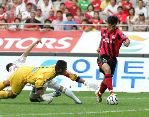 경기장을 돌며 사인볼을 차며 인사하는 최용수 코치